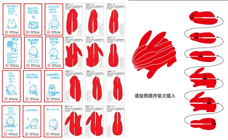 新年将至,洽洽又有新花样,这次的文化卡片依然是套卡,不过集齐了6张,惊喜不仅仅是可以收集时下最流行的漫画家胖兔子粥粥带给你憨态可掬的兔言兔语,更有意思的是,喜欢自己动手DIY的朋友,可以参照图片说明,用这六张卡片,神奇的拼出一只生动的兔子,而且是立体的兔子。想在兔年行大运的朋友们一定不能错过。