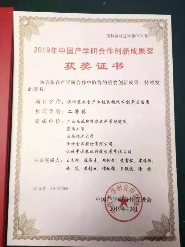 12月31日,第十三届中国产学研合作创新大会在北京隆重召开,洽洽受邀参加此次大会及颁奖典礼。会上,由洽洽、南亚所、暨南大学、西南林业大学和江城中澳农业科技发展有限公司共同申报的“澳洲坚果全产业链关键技术研究与应用”荣获2019年中国产学研合作创新成果奖二等奖。
