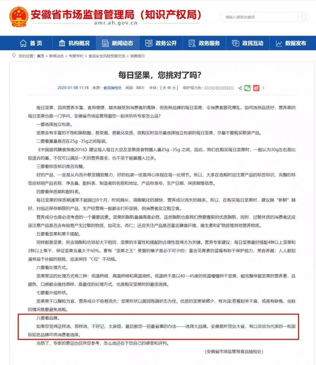 为此,安徽省市场监管局发表一篇关于《每日坚果,您挑对了吗?》的文章,其中指出:选每日坚果最省事的办法——选择大品牌。并且提出尤以洽洽为代表的一批国际知名品牌可供消费者选择。