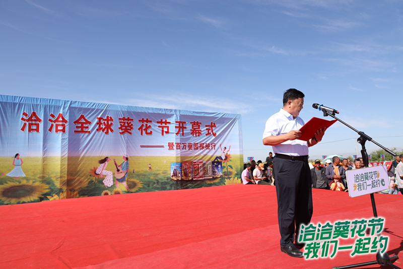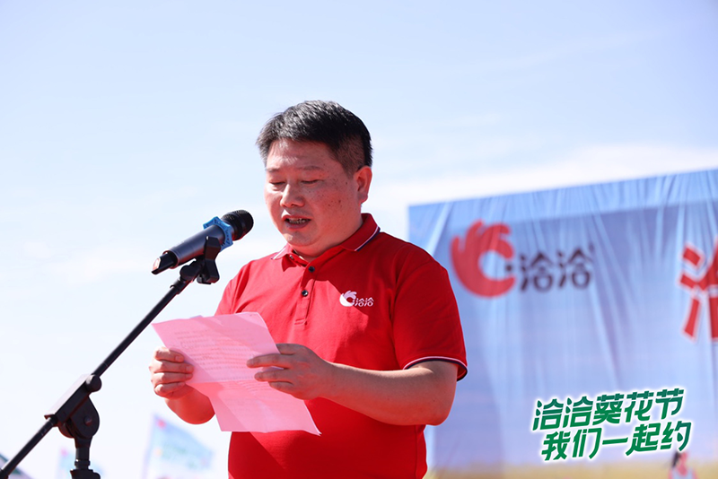 市、旗领导邱永红、郭宏、王国栋、李怀义以及洽洽食品集团副总裁陈俊等出席了洽洽全球葵花节的开幕式。在开幕仪式上,政府副旗长王新禄以及洽洽食品集团副总裁陈俊分别就此次活动进行了致辞,其中陈俊总表示“洽洽食品华葵农业部在推广订单农业的过程中,和巴彦淖尔地区展开密切合作,助力巴彦淖尔地区食葵在品种资源端不断创新进步发展”,并许下了希望和巴彦淖尔食葵产业一起“走出中国、走出亚洲、走向全球”的希冀,两方代表皆对洽洽与内蒙合作开展此次活动的意义进行了肯定,并对到场的消费者粉丝表达了美好祝愿。最后,市政府副市长邱永红宣布“洽洽全球葵花节”活动正式开始。