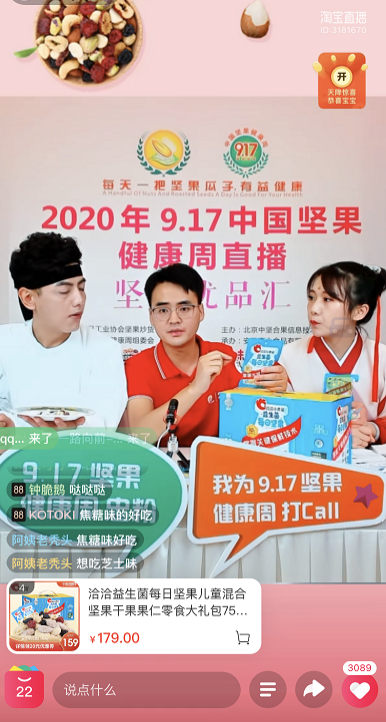 同期“坚果优品带货直播”活动于下午2:00在淘宝直播举行,洽洽食品首席增长官王斌现身直播间,现场讲述洽洽坚果保鲜的奥秘,科普坚果营养知识,洽洽蓝袋风味系列瓜子、洽洽益生菌每日坚果2款产品均在直播间亮相!