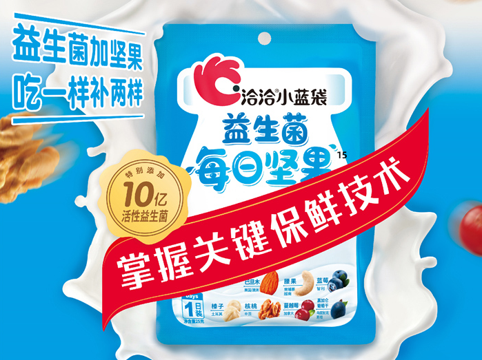 随着消费者对健康食品的格外关注,坚果类食品因营养丰富成了人们心目中理想的爆款零食,洽洽食品更是凭借着科技创新与新鲜品质一度领“鲜”坚果市场。当单一口味的坚果不能满足消费者需求,洽洽先后创新性地推出了“小黄袋每日坚果”、“小蓝袋益生菌每日坚果”等新品。