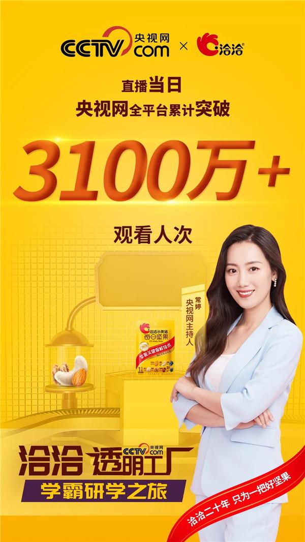 9月27日洽洽透明工厂央视网直播当天,全网网友跟随学霸研学游的脚步,对洽洽坚果的种植、采摘,以及保鲜仓、低温烘焙、智能立仓等关键环节有了深入的了解,并通过学霸游戏互动环节加深了对洽洽全产业链匠心质造的深刻印象。