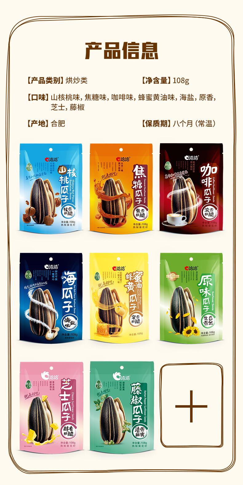 焦糖瓜子、山核桃瓜子、蜂蜜黄油瓜子、藤椒瓜子、芝士瓜子、海瓜子;